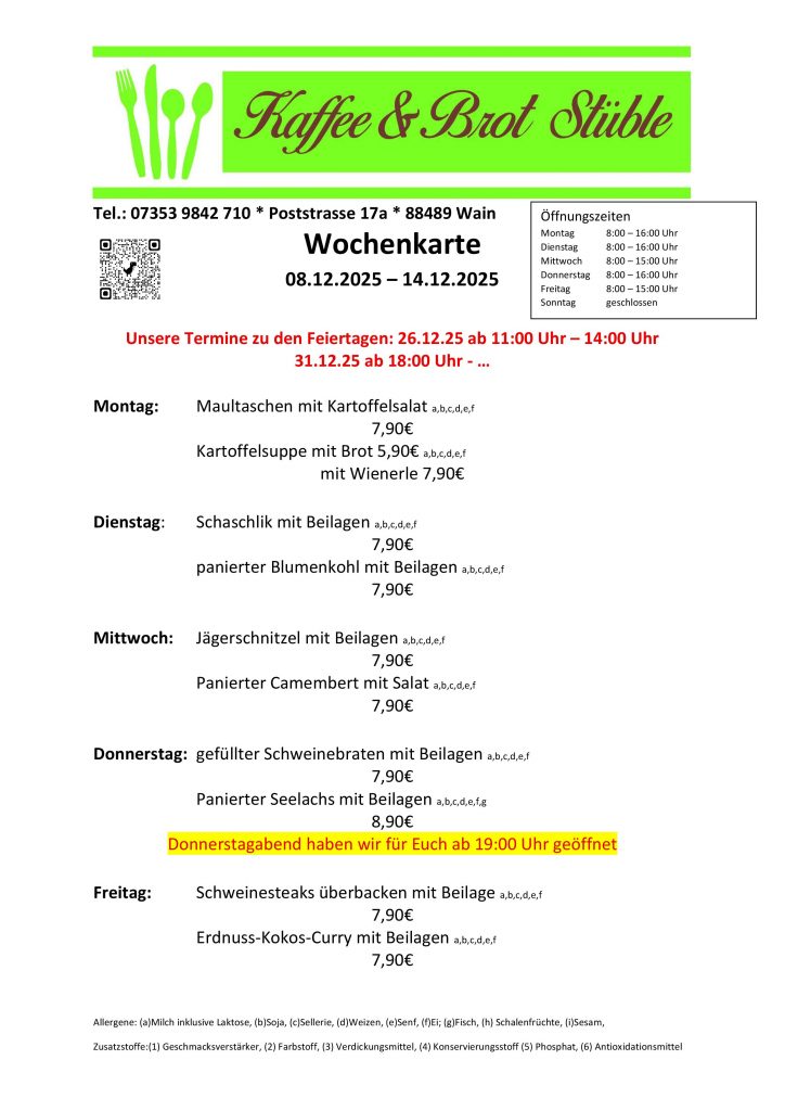 wir treffen Euch gerne zur Abholung oder zum Verzehren vor Ort unserer Speisen im Kaffee und Brot Stüble in der Poststrasse 17.