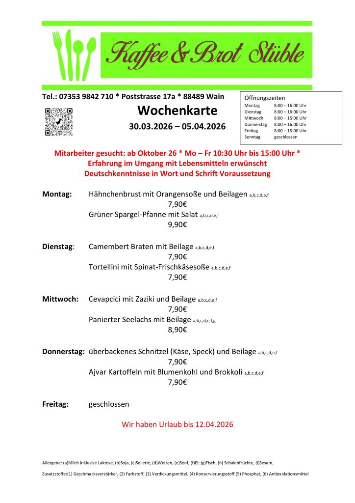 wir treffen Euch gerne zur Abholung oder zum Verzehren vor Ort unserer Speisen im Kaffee und Brot Stüble in der Poststrasse 17.